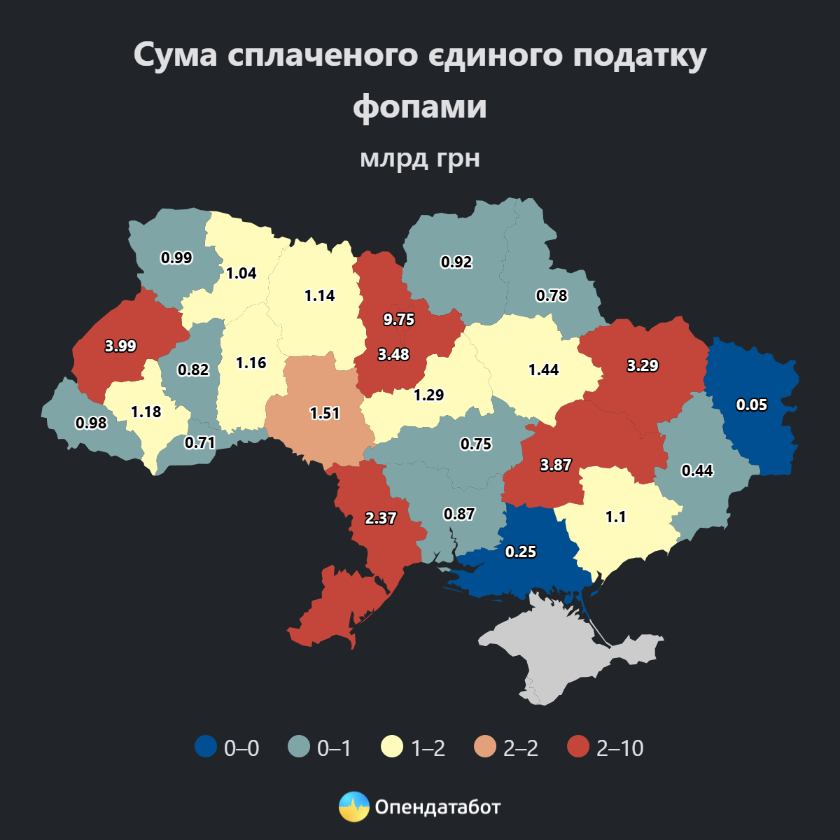 Традиційно перше місце за сплатою єдиного податку утримує Київ (9,75 млрд грн або 22% усіх надходжень). Далі — Львівська область (3,99 млрд грн, 9%) та Дніпропетровська область (3,87 млрд грн, 8,8%).