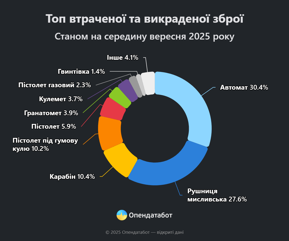 «В абсолютній більшості випадків зброю не крадуть, а втрачають. 94% усього обсягу становлять саме втрати, тоді як на викрадення припадає 6%.», — пояснюють у «Опендатабот».
