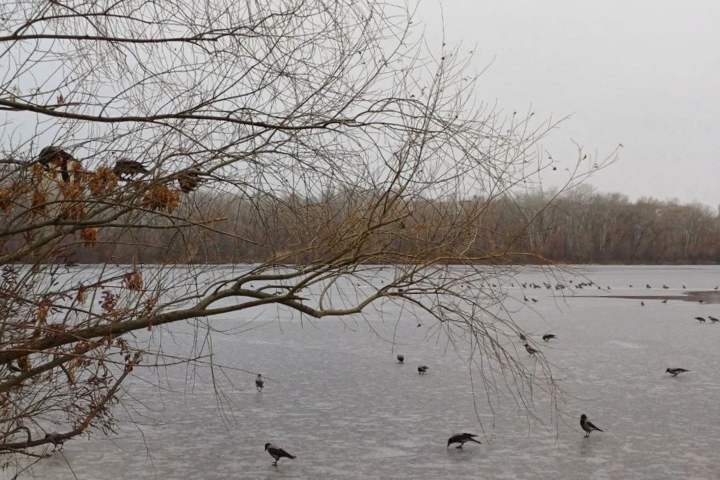У ясні дні — небо інтенсивно блакитне, і відблиск снігу стає сліпучим. Люди обгорнуті шарфами, але дехто все ж відшукує красу в цьому стерильному, лаконічному ландшафті. Вода в такі моменти — як памʼять: вона чекає весни, але одночасно виглядає гідною та непорушною.